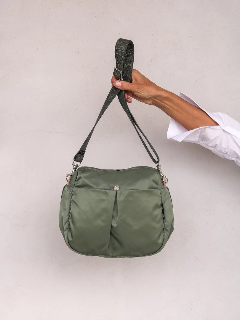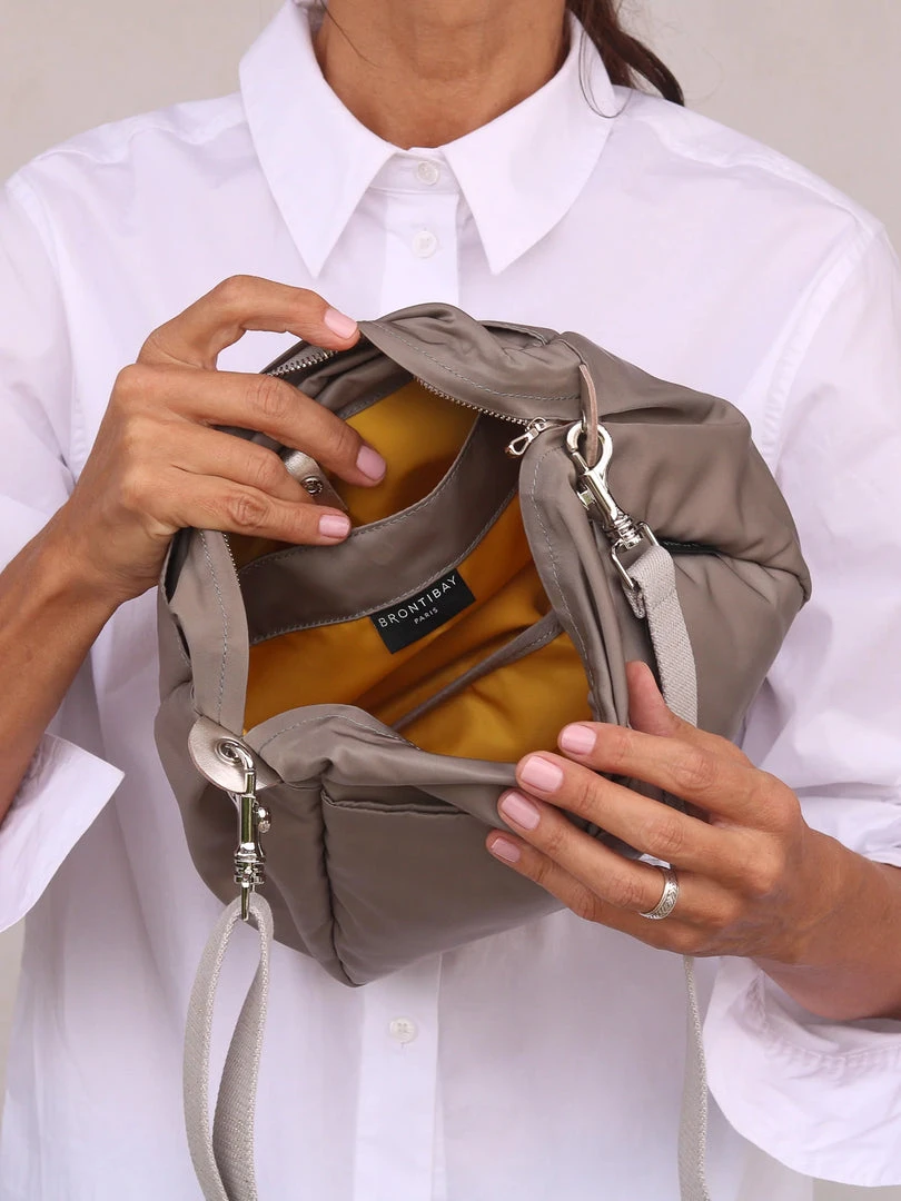 You will love the hands free life with our Ravello bag in satin nylon and light gold leather details. Ravello has a silver zipper closure, 2 outside snap pockets and a comfortable 1.25″ woven lurex shoulder strap. Ravello is light, practical, fun and comfortable to use. For a larger size, see Kit satin nylon bag. For the same style in a metallic finish try the Westside Glam.