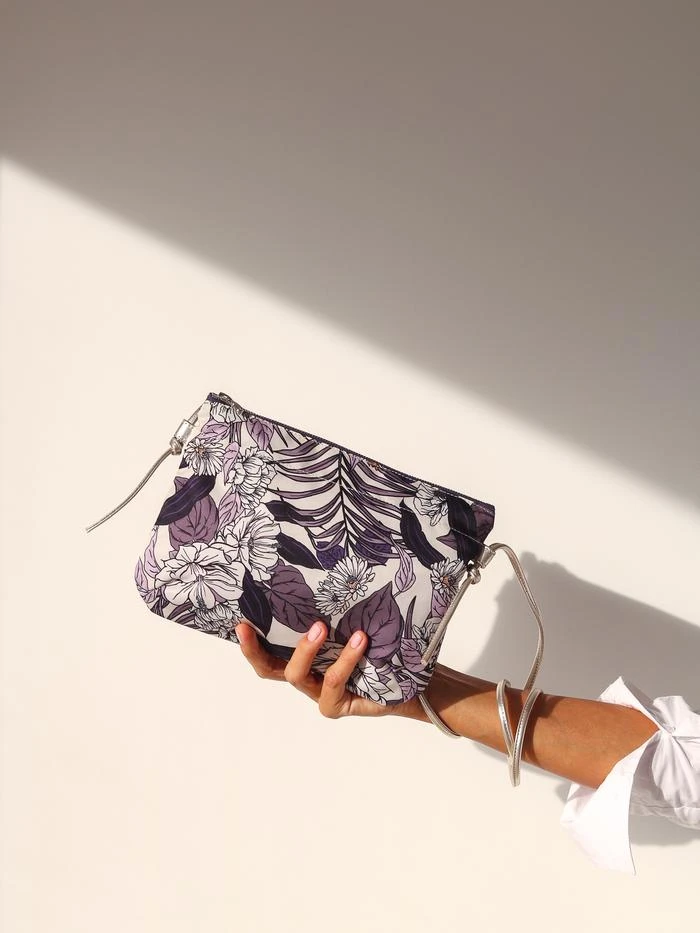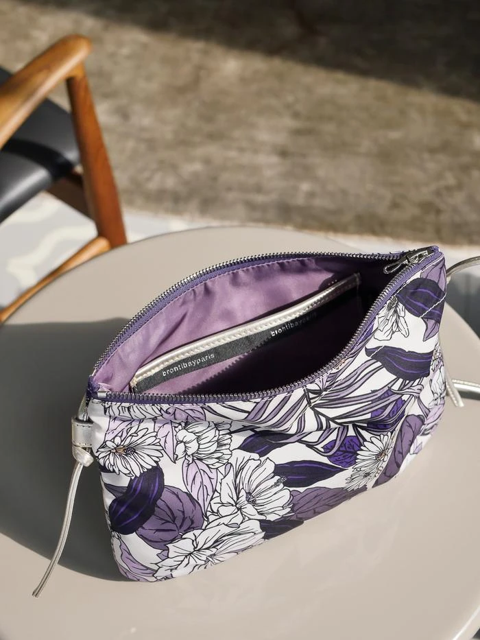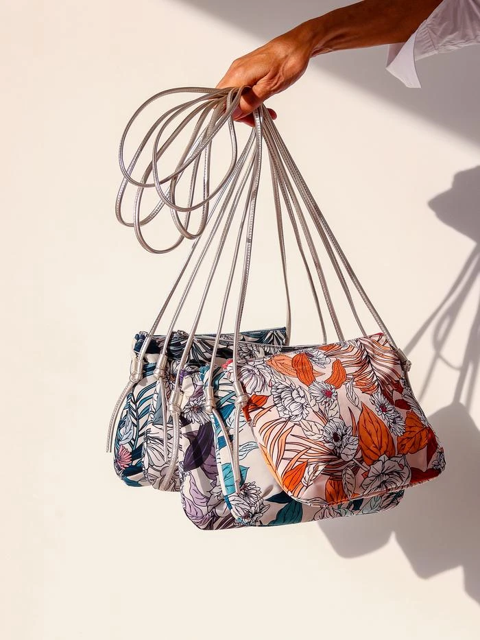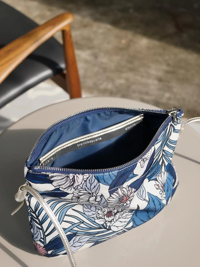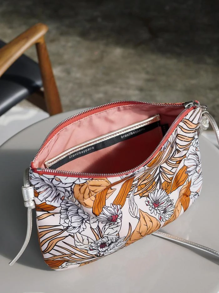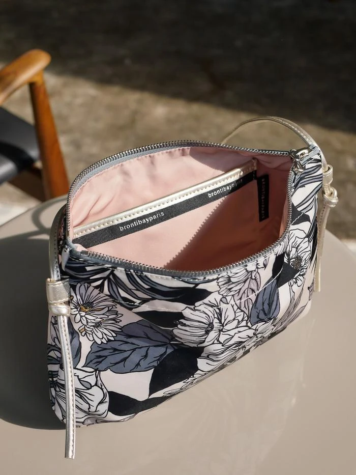 NEW | Brera, the satin nylon crossover bag with Floral print, exclusive Brontibay design, with its adjustable shoulder strap in metallic full grain leather. Ideal size for your essentials.
