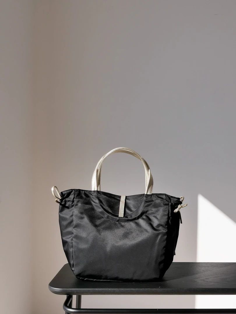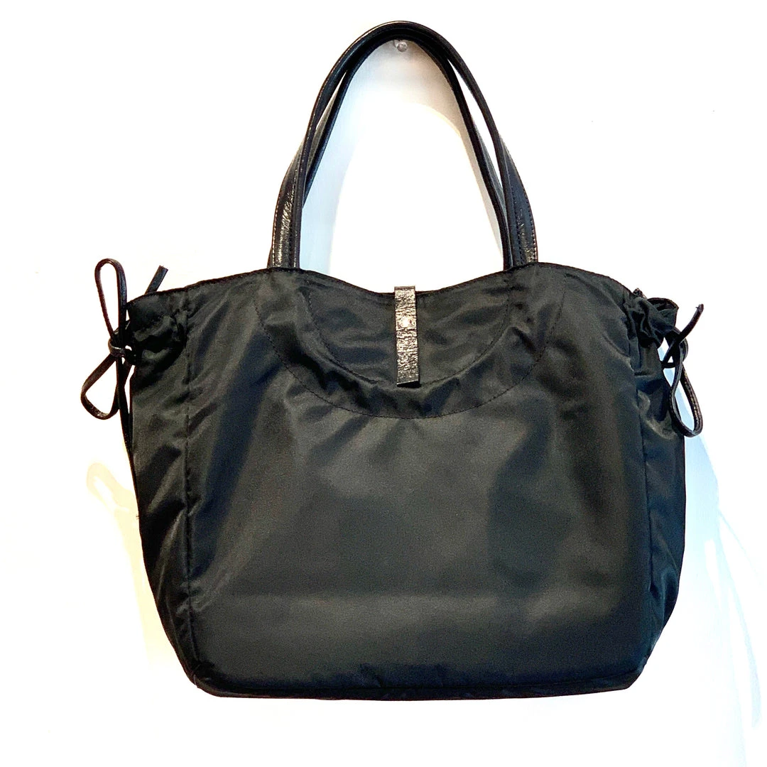Naples emblematic tote bag, inspired by the 60’s movie “Dolce vita”, in satin nylon, rounded handles in full grain leather, light, with separation pocket and inside zipped pocket, handy. Bag expands lengthwise by about 2-3″ by undoing and retying leather straps on the side.