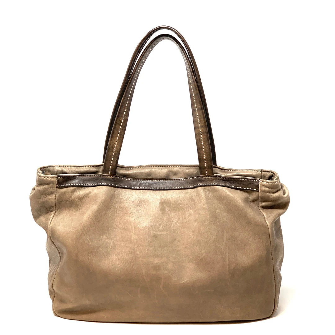 Leather tote with an ornate hand appliquéd abstract leaf motif on one side and a natural, raw leather side on the other for two different looks. Shoulder straps have a long generous drop of 14″ and comes with a detachable crossbody belt strap that is fully adjustable.