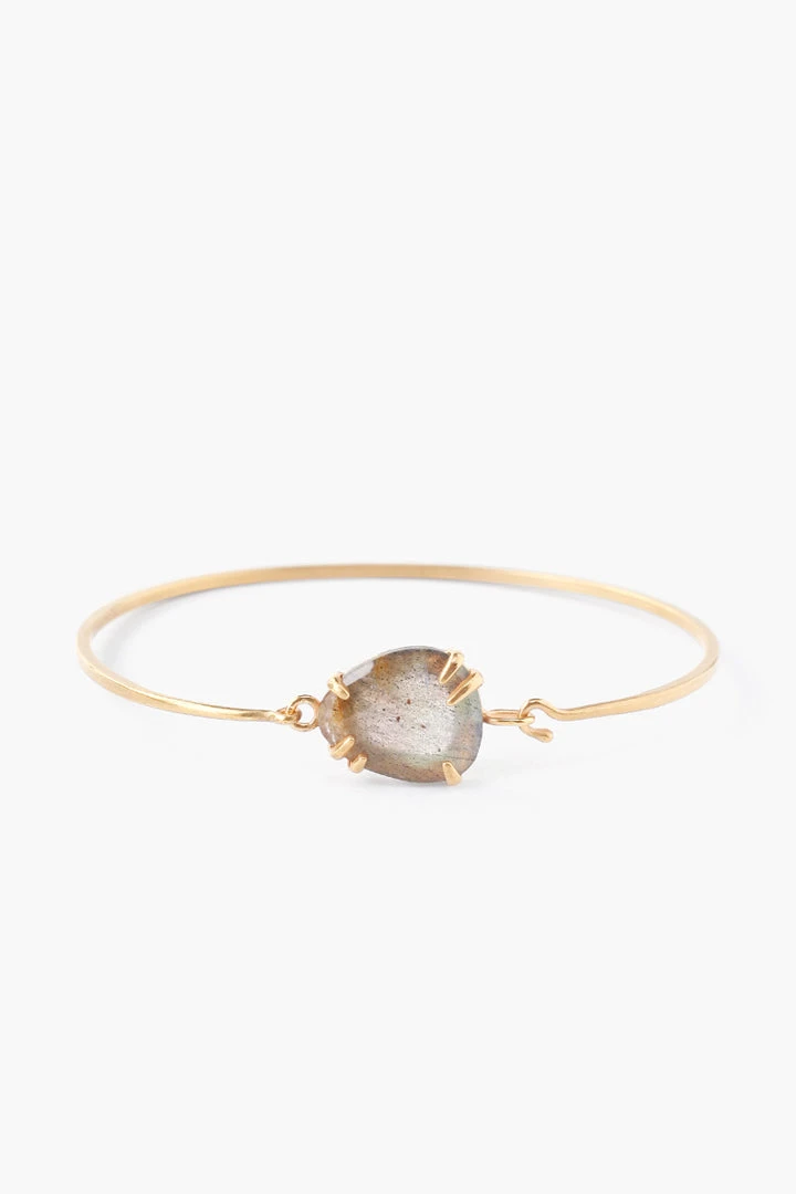 This bangle features a semi-precious accent stone on a prong setting. We love that it’s easy to get on and secure