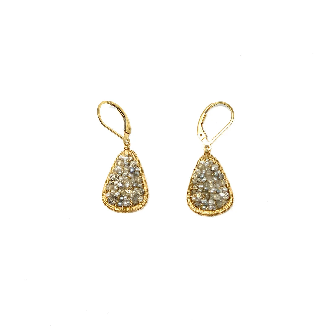 These elegant drops feature dozens of shimmering labradorite, moonstones, grey pearls, and crystals, hand woven 14K gold filled wire. Surprisingly light for a dramatic statement piece, these will elevate your mood and your look from day to night.Â