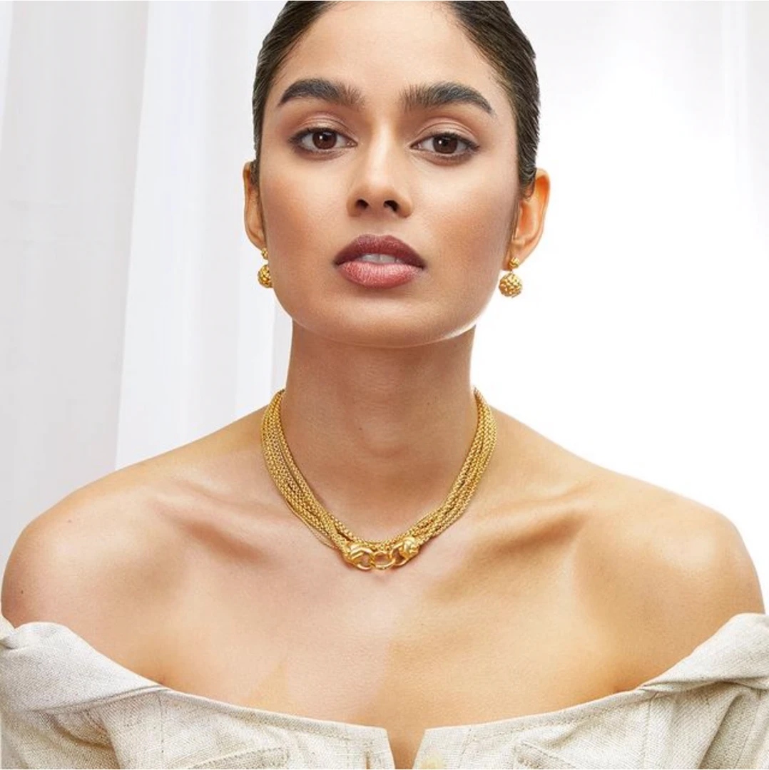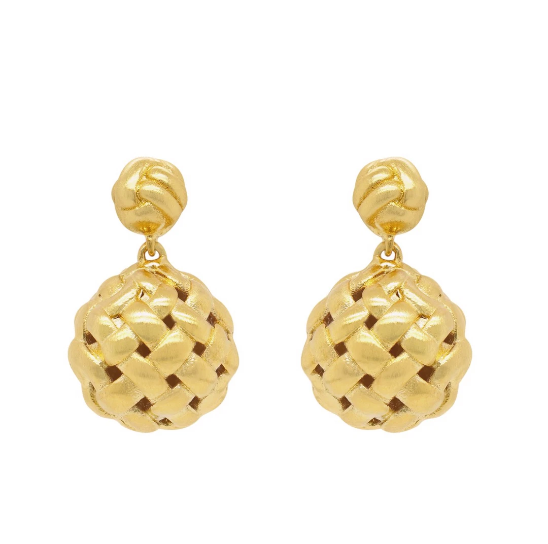 The Braided Orb Droplet Earrings each feature a hollow golden basket suspended from a woven knot stud. Remarkable in both their lightweight construction and intricate details, the sumptuous texture of the earrings are enhanced by DD’s signature brushed gold finish.