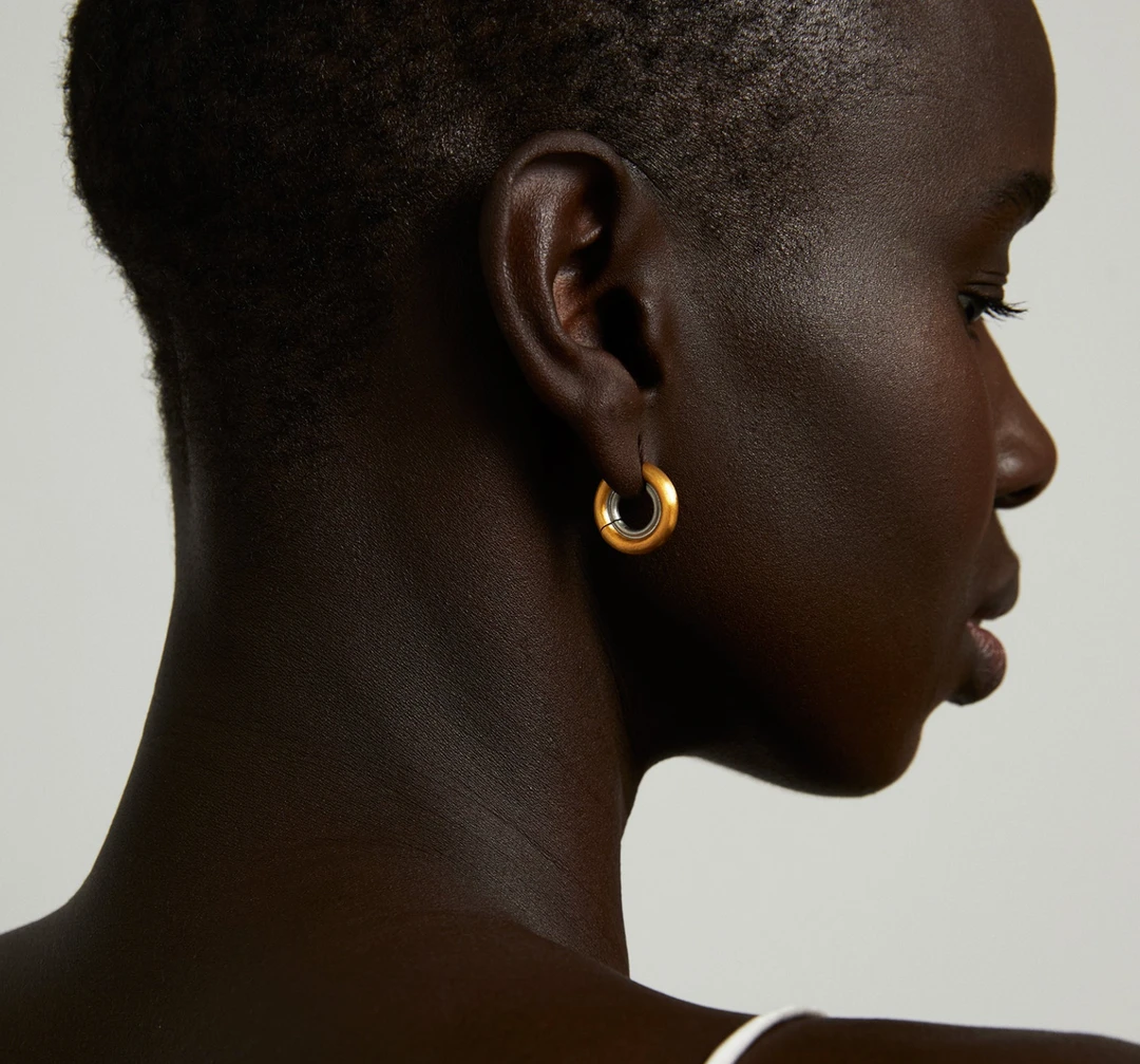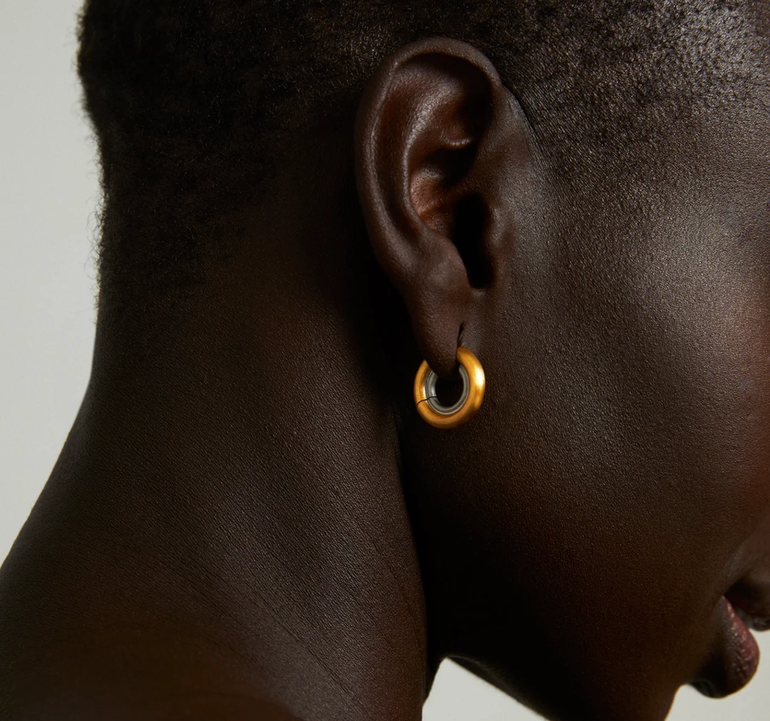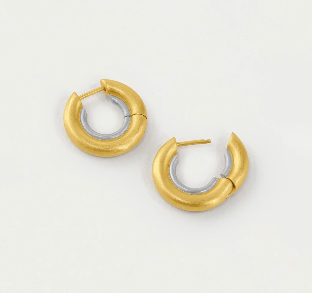 Reminiscent of a sand dune’s curved shape, the Crescent Hinged Huggies are small yet statement-making. A delicate ring of silver lines the interior of this bold brushed gold huggie, creating an eye-catching contrast.