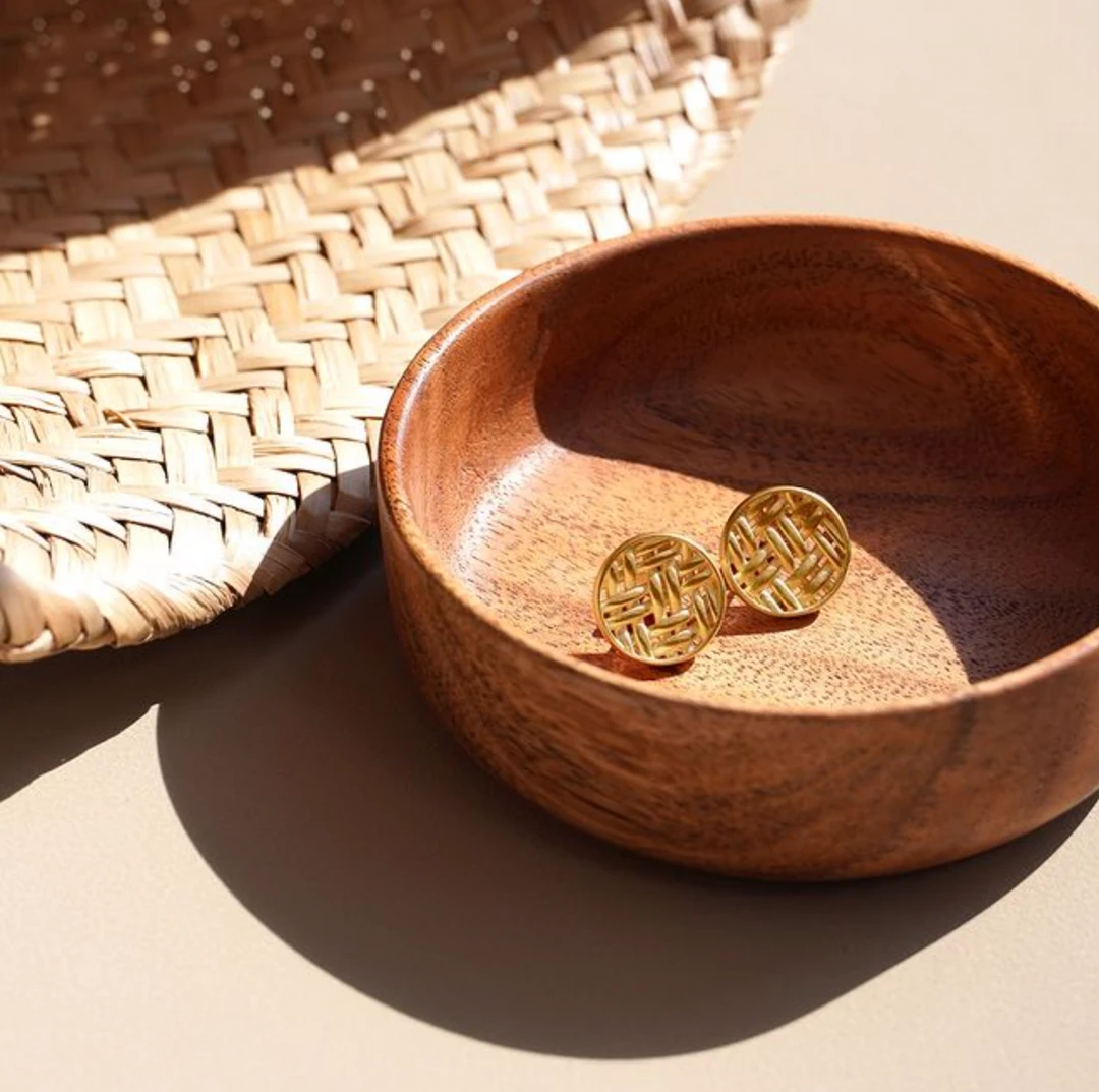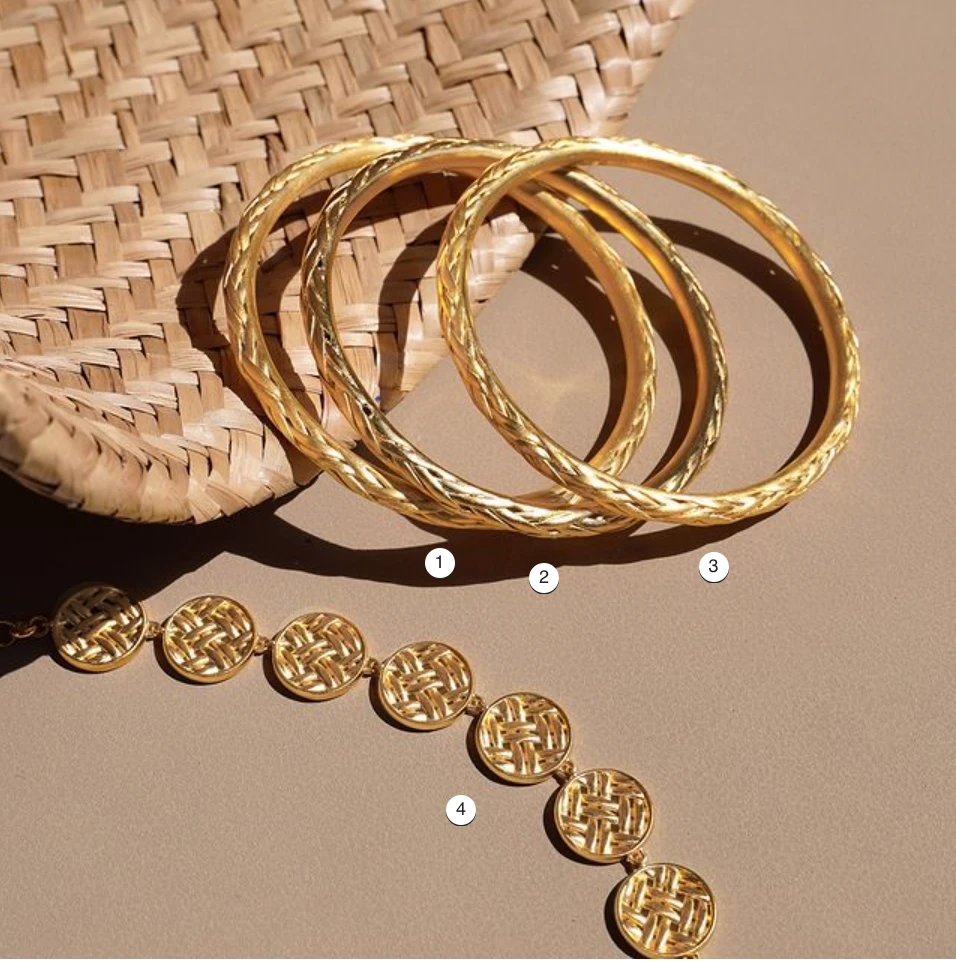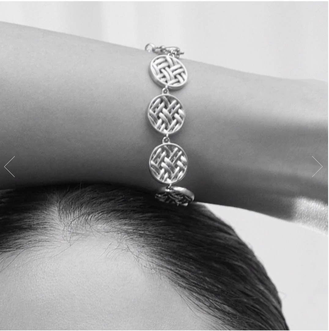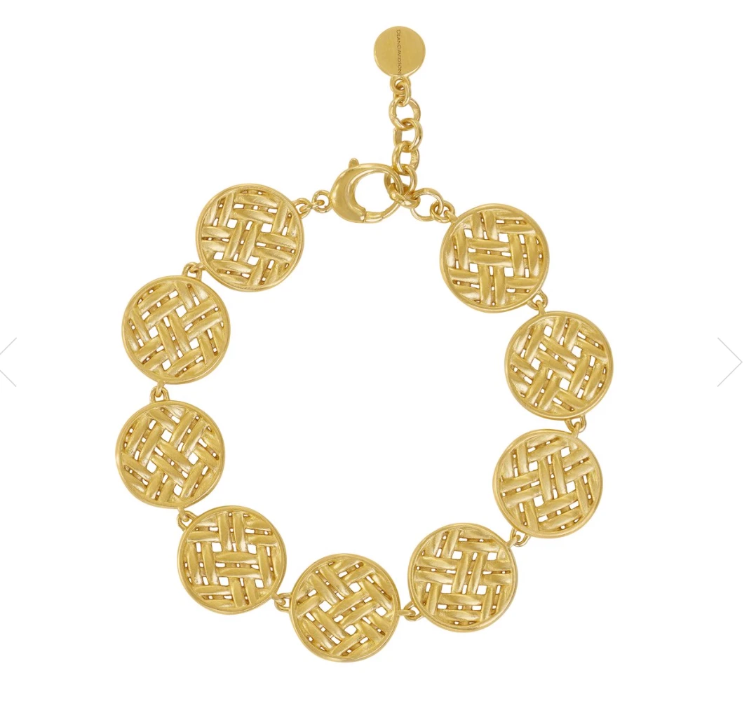 The Gilded Lontar Bracelet features a chain of nine brushed gold discs that are evocative of woven baskets. With an adjustable length chain and lobster clasp closure, the interlaced golden strands allow skin to peek through the empty spaces as the bracelet elegantly encircles the wrist. Â Matching Stud earring.Â