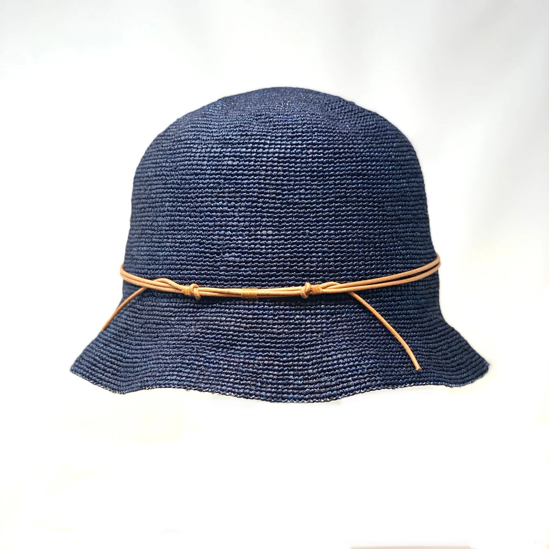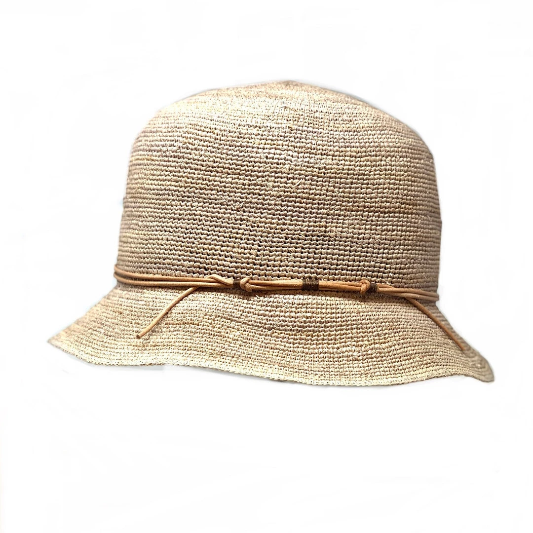 Raffia Hat made from uniquely textured weave pattern. Interior band hides an adjustor with velcro closure that easily tightens or loosens the hat 1 size.Â