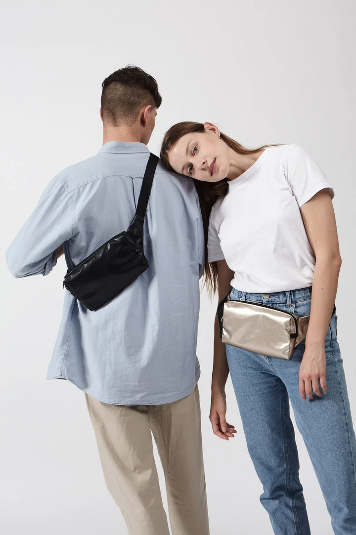 Cute enough to wear across the front of the chest or on the back if your waist or fanny aren’t your favorite areas to accent. The black buckle strap is an easy quick release but also incredibly sturdy and secure and can be adjusted to go very long