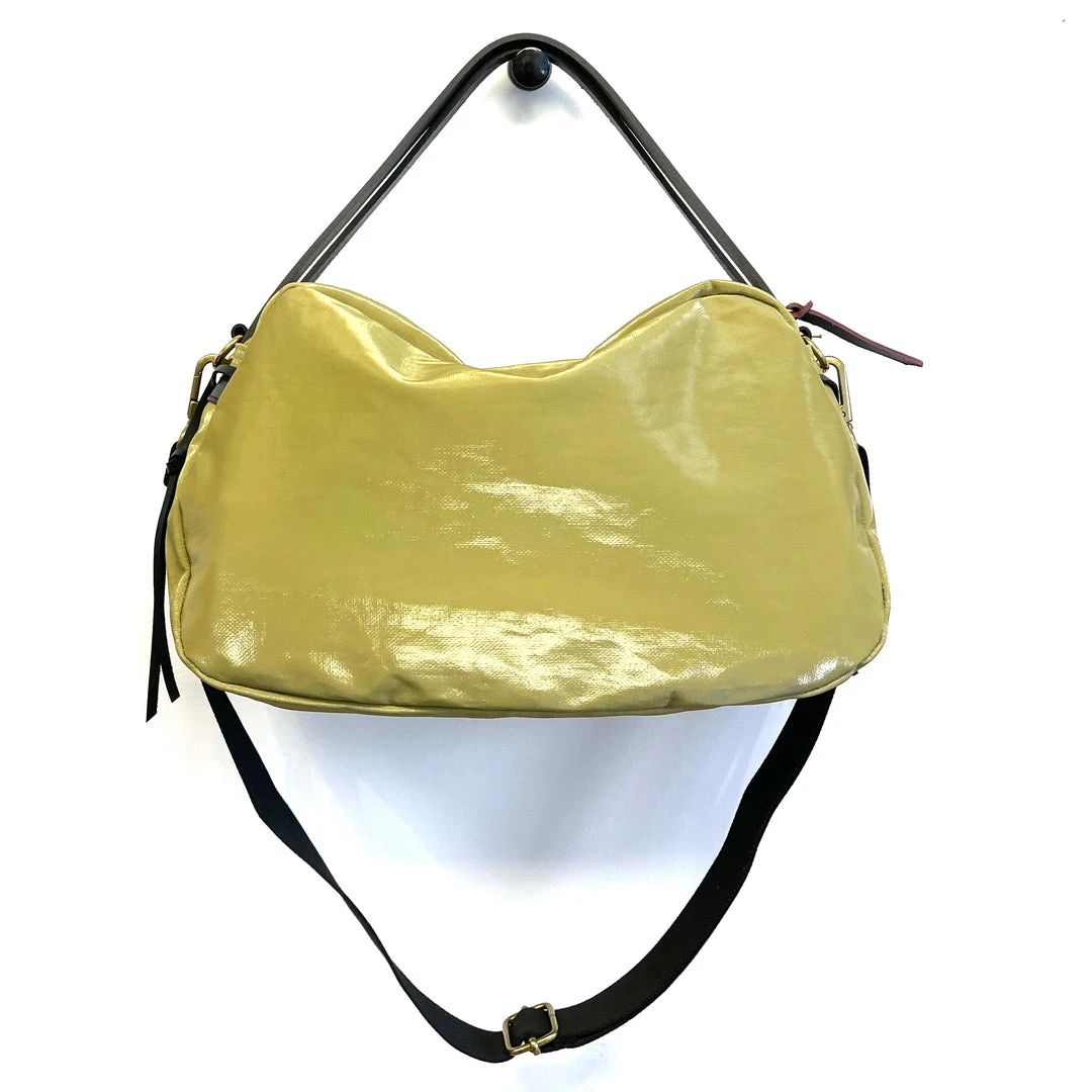 Made in France * Gold hardware with black leather accents * Short handles plus a detachable adjustable black webbing shoulder strap 26″L