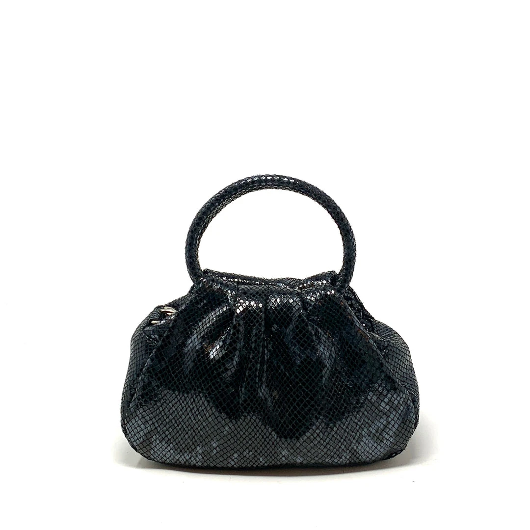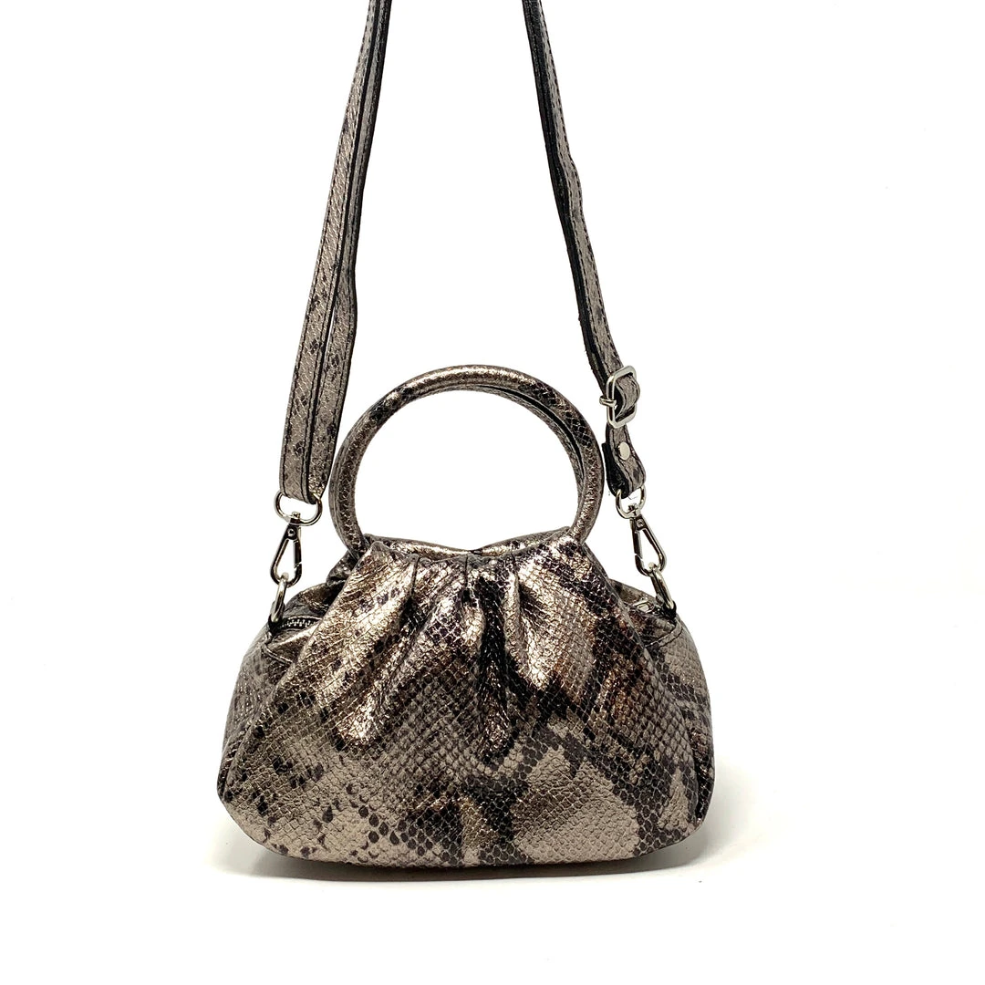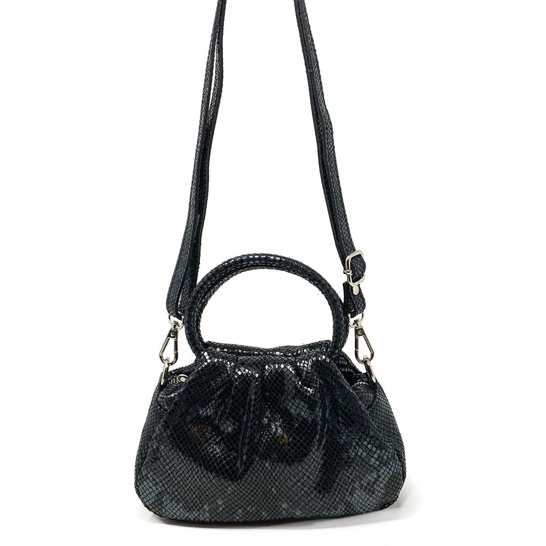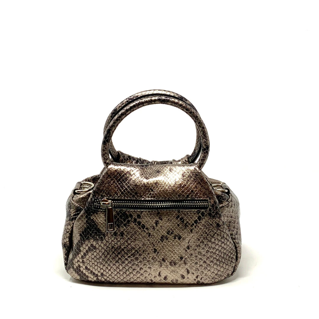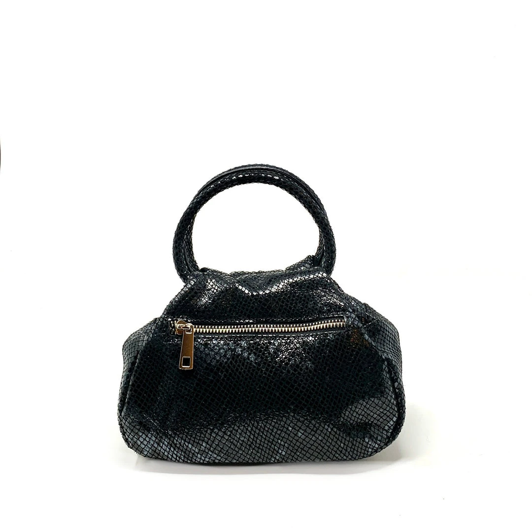 All leather satchel with silver hardware details, zipper closure and magnet snap. Interior zip pocket.