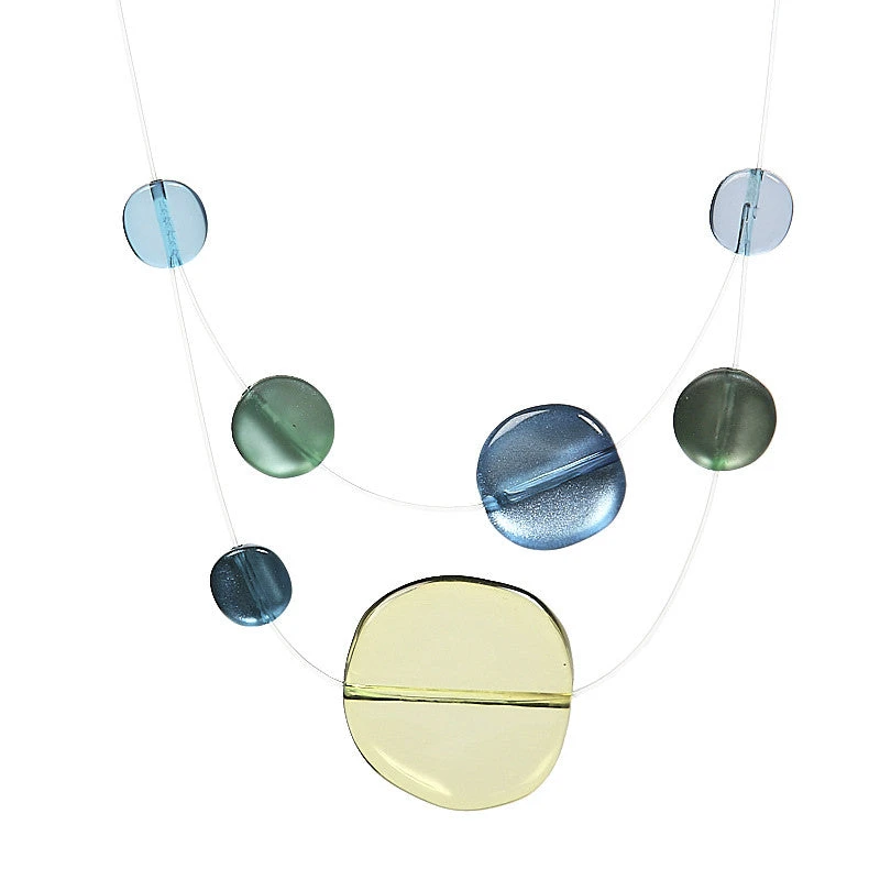 Small circles of diameters ranging from .25″-1″ assembled on a clear fishing line