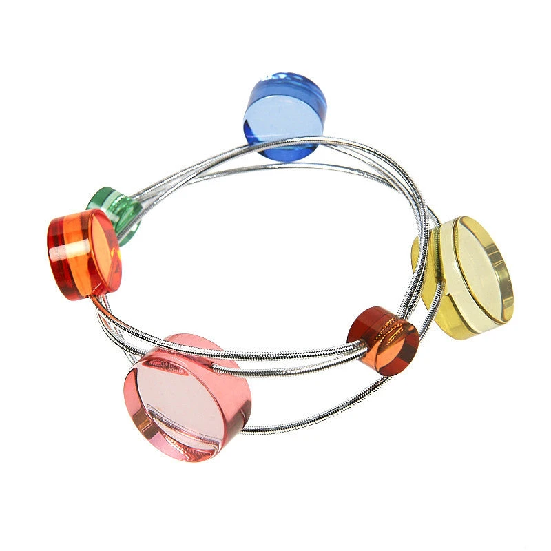 Small raised circles of diameters ranging from .5″-1″Â assembled on a stretchy metallic elastic thread (no nickel)The inner diameter is around 3″Â –one size.