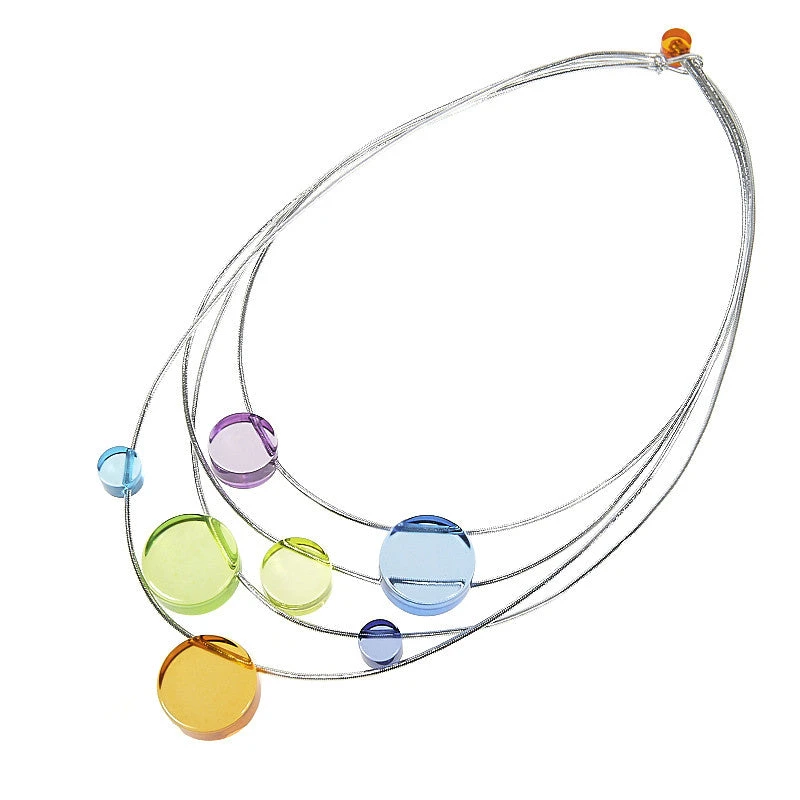 Small raised circles of diameters ranging from .25″-1″ assembled on a metallic elastic thread (no nickel)