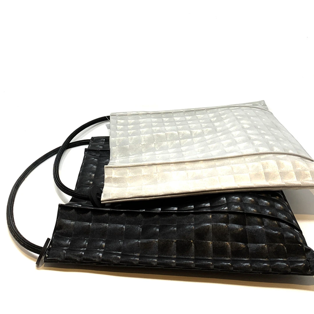 The bag is made from a unique material that is upcycled, waterproof, flexible, technical fabric like a vinyl which has a