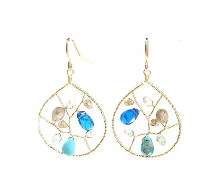 14K gold Filled wire wrapped around a web of teardrop labradorite, apatite, blue topaz turquoise, lapis.