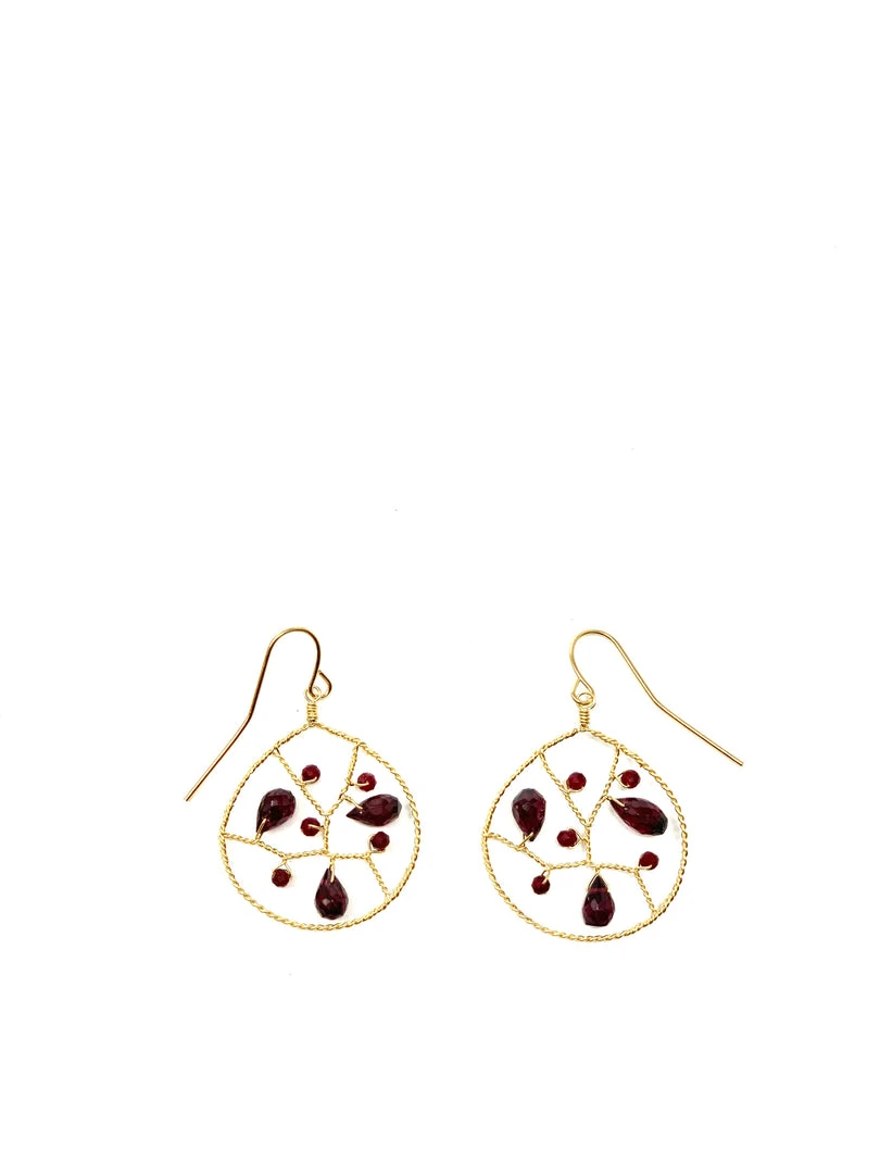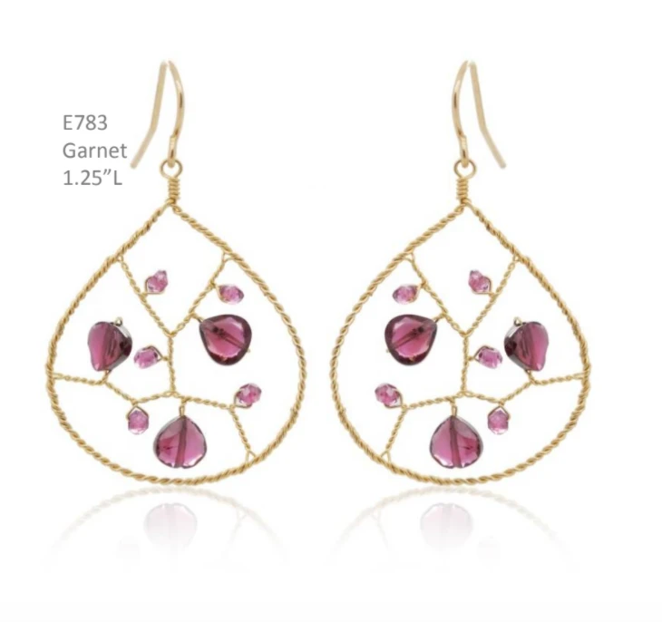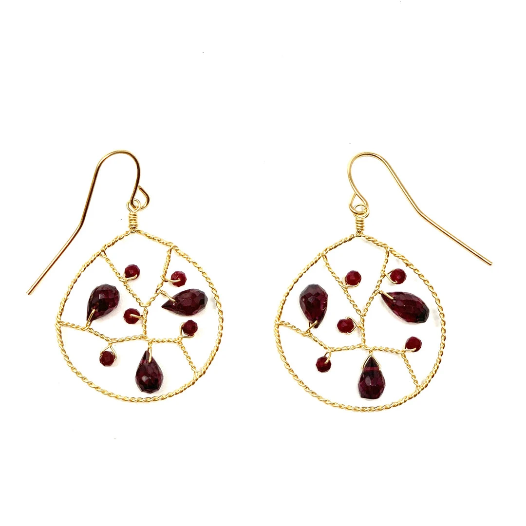 14K gold Filled wire wrapped around a web of teardrop garnets.