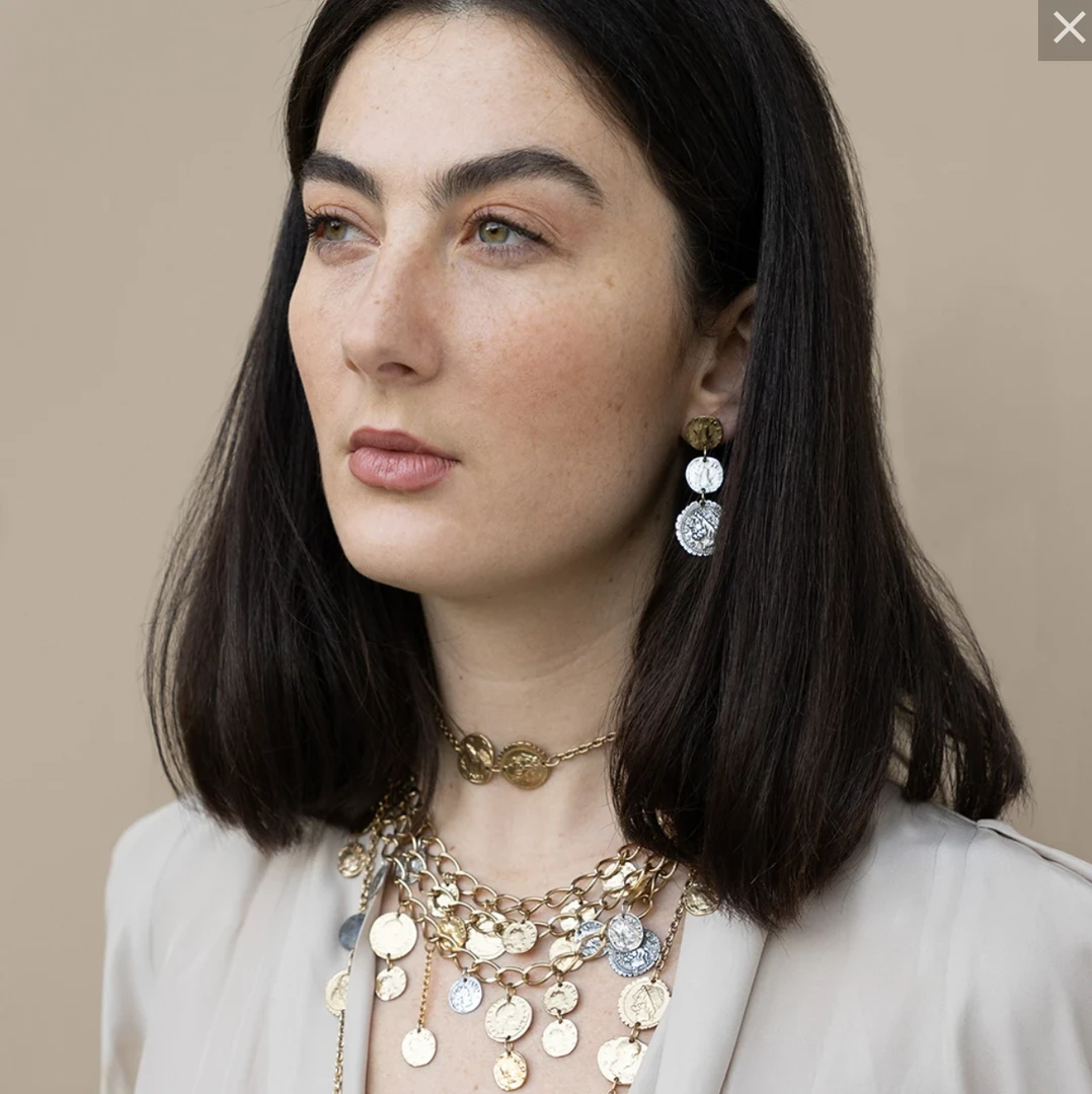 During her travels across the globe, designer Briana Erin has collected antique coins from their native regions. She incorporates fragments and elements into her designs, creating wearable, historic treasures.