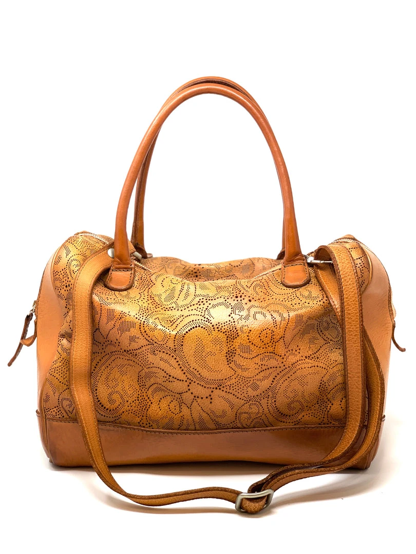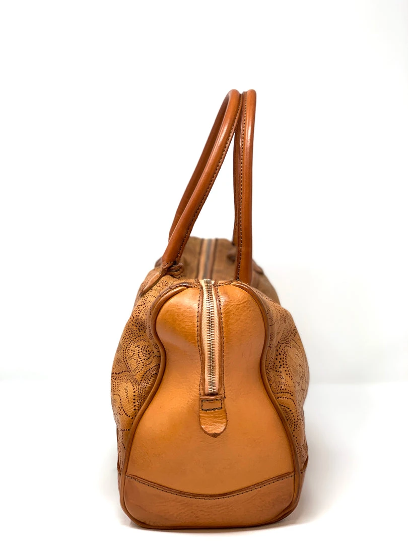 Medium Satchel with shoulder length straps. This bag is made of a beautiful hand punctured leather that creates a modern floral lace pattern across the surface of the bag. The tan and cherry dyes add a pleasing light gloss to supple leather.