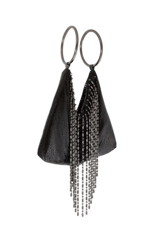 Glamorous Whiting & Davis ball fringe bracelet bag is the perfect go to bag for any time of day. This vintage inspired metal-mesh ball fringe handbag is an eye catching accessory. Can be dressed up for a cocktail party or wedding or down for an afternoon out with friends. The double-ring handles add a glamorous touch around your wrist while keeping your hands free for hors d’oeuvers and cocktails.